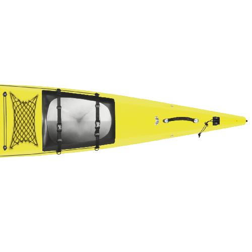 • caiacul detine doua zone de depozitare (una situata in varful caiacului si una in spatele utilizatorului)  pentru bagaje, sigilate impotriva patrunderii apei printr-o husa de neopren elastica asigurata de un capac cauciucat fixat cu cate doua chingi.